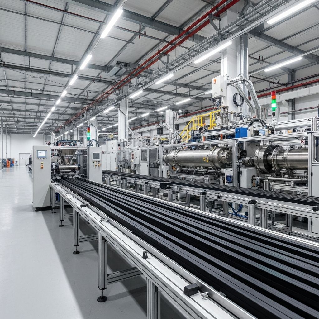 Turnkey extruder handling system delivering 8 TPH capacity for automotive seals and gaskets with integrated weighing and feeding for precision material control.